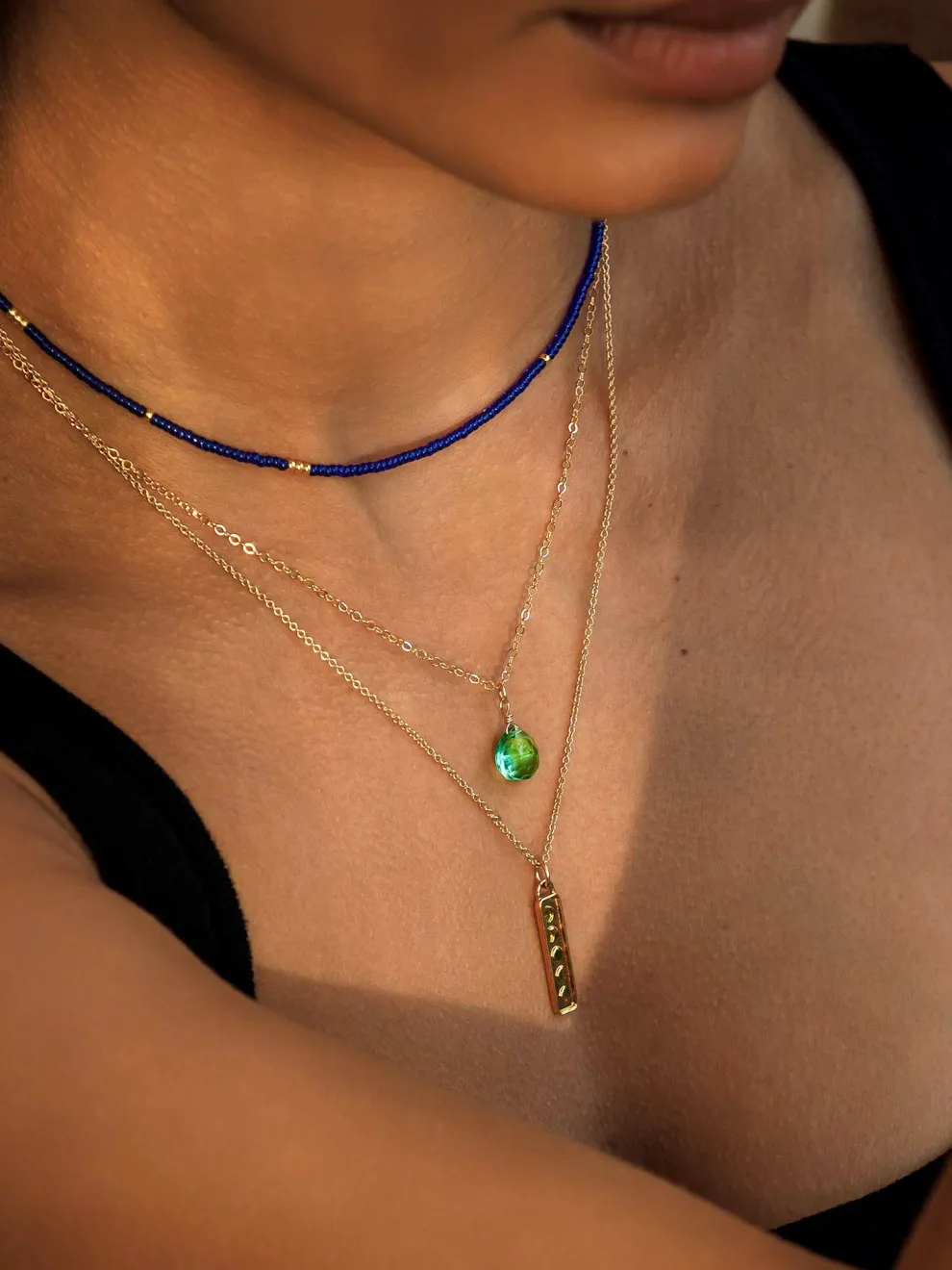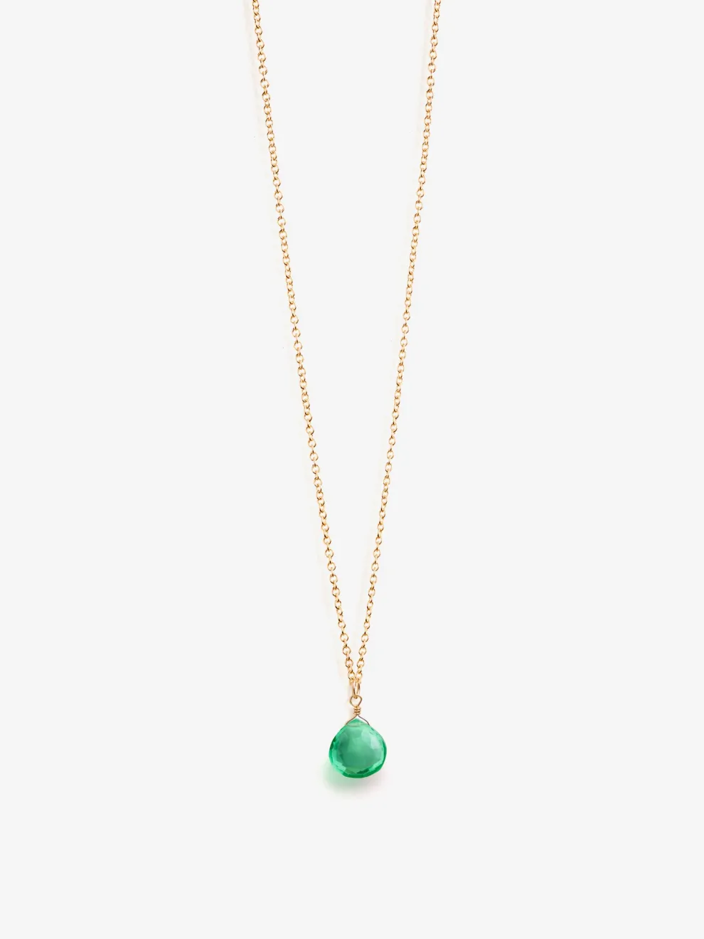 A quartz gemstone in Wanderlust Life’s signature shape captures the delicate colour of seawater as it floats on a fine gold chain.