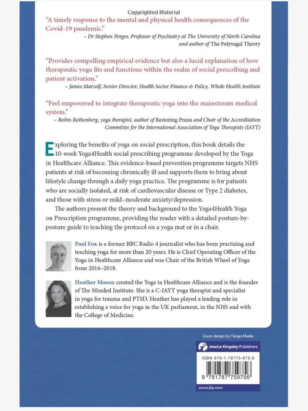The authors, Paul Fox and Heather Mason, present the theory and background to the Yoga4Health Yoga on Prescription programme, providing the reader with a detailed posture-by-posture guide to teaching the protocol on a yoga mat, on the floor or in a chair. Inspiring lifestyle changes that will positively affect long- and short-term health, Yoga on Prescription is the perfect companion to anyone wanting to teach the yoga for health and wellbeing.