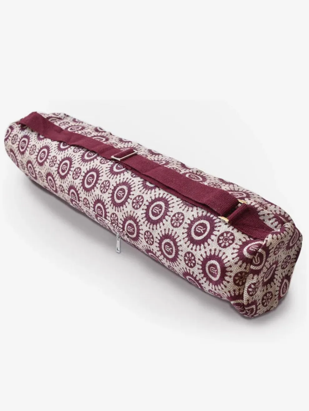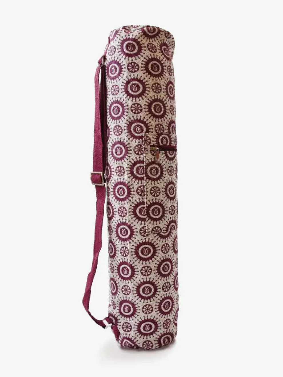 A strong and durable yoga mat bag made from 100% cotton and jute, featuring the block-printed Yoga United flower design. This bag provides an extra layer of convenience for your yoga practice, with a strap for transport and plenty of room for your mat. The strong material, zips and stitching ensures the bag will withstand daily wear and tear.