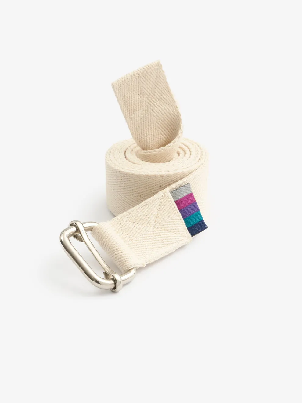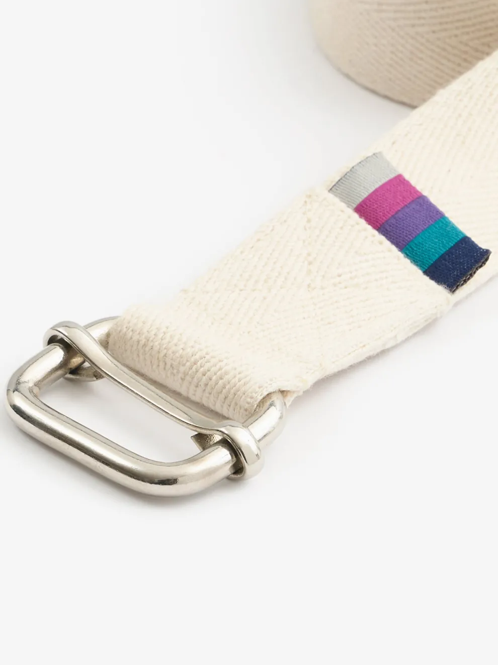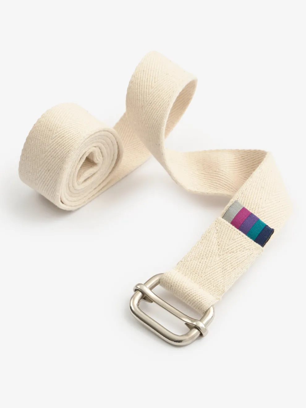 Belts are regularly used in poses such as paschimottanasana (forward bend) and gomukhasana (cow face pose) to extend and lengthen reach. This classic cotton belt, with its sliding bar metal buckle, is a favourite especially in Iyengar institutes across the world.